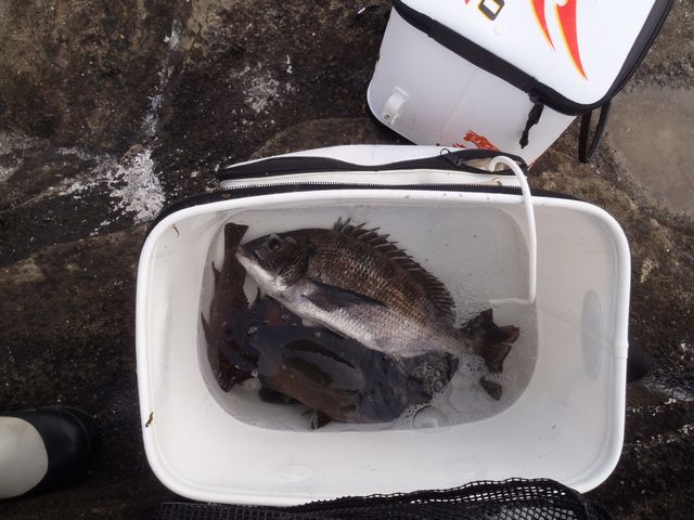 2012年4月21日: 南房総・富浦 レポーター:齊藤 利之 《ブダイ島》 タックル ロッド:ダイコー 釣技レジェンド1.25号 リール: 2500番 道糸: SUNLINE / サンライン ビジブルHI-Color 1.5号 ハリス: SUNLINE / ブラックストリーム 1.25号〜1.5号 ウキ:KIZKURA / STR 0・B,黒魂0 針:YAIBA / 閃烈グレライト5号・遠投mode 1.5号・2号 撒き餌: マルキュー/ オキアミ9kg・瀬戸内チヌ・チヌパワーV10・白チヌ・チヌパワームギ 付け餌: レポート 昨年末ファイナル大会で頂いたチヌ用コマセ3袋を持ち、 千葉県南房総の富浦沖磯に行ってきました。 釣行当日は、北風が吹きこの時期にしては少々肌寒い日でした。 午前5時過ぎ共栄渡船にて富浦新港を出港し、 大房岬の南側に位置するブダイ島に降りました。 この島の周囲は、カジメ林やゴロタ石で形成され、点々と有る砂地周辺が ポイントになり水深も満潮で5m前後と浅い場所ですが、 魚影は濃く特に冬〜春に大型のメジナ・クロダイが仕留められています。 釣り開始早々から手のひらサイズのメジナやフグ・ベラ等が釣れてきます。 足元や近距離の根周りを攻めましたが、 やはりエサ取りが多くどうも型が伸びません。 しからば遠投で勝負と思い、針を閃烈グレライト5号から 投入時のエサのズレ防止を考慮したフカセ遠投mode2号に結び替え投入です。 1投目から30cm弱のメジナが釣れ型も少々良くなり期待していた数投後です。 強い引きで何度か根に張り付かれ道糸のテンションを緩めたり 少々強引なやり取りをしたりしてユラユラとヒラを打って上がってきたのは 綺麗なクロダイです。 その後は、30cm弱のメジナの数釣りでした。 遠投しても付け餌がしっかりと針に付いていれば魚は釣れると改めて認識し フカセ遠投modeは心強いアイテムだと感じました。 港に戻りクロダイを計測してもらうと43cm、 最後に船長と記念撮影をして帰路に着きました。 43cmの黒鯛です。 メジナ&黒鯛 共栄渡船の船長とハイポーズ Copyright(C) 横浜真ぐれ会(SINCE 2000.) No.2015 All Rights Reserved. Design by Akira.O